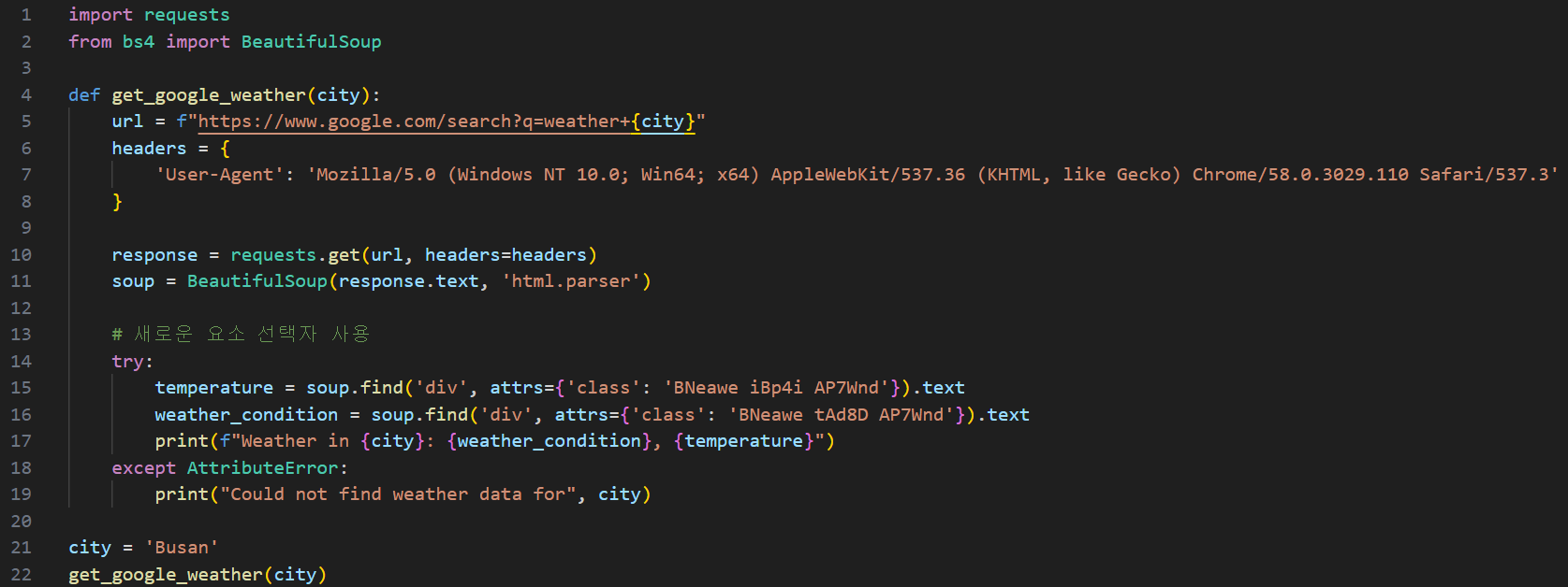url: 구글 검색 URL을 설정 / 이 코드에서는 도시 이름에 따라 날씨 검색