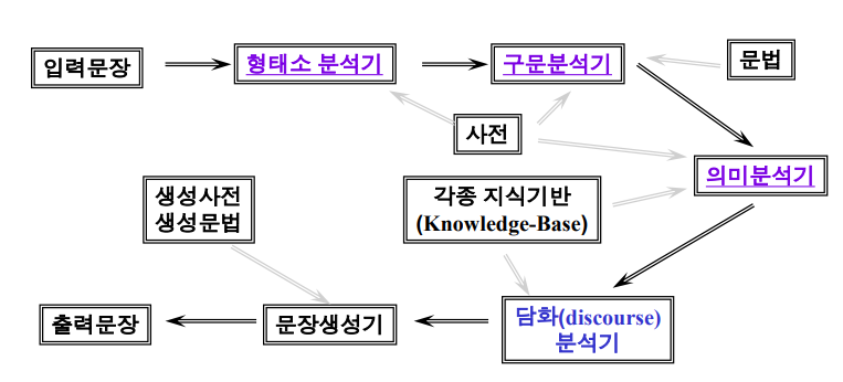 - 처리과정(기계변역): 어휘분석 - 구문분석(모호성 처리) - 의미분석(모호성 처리) - 목전언어생성