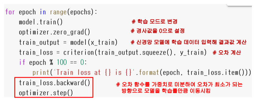 한 번 학습 시 실제와 테스트의 오차를 줄이는 방향으로 가중치를 조금씩 조절해야 함 (5번째 줄 알고리즘)