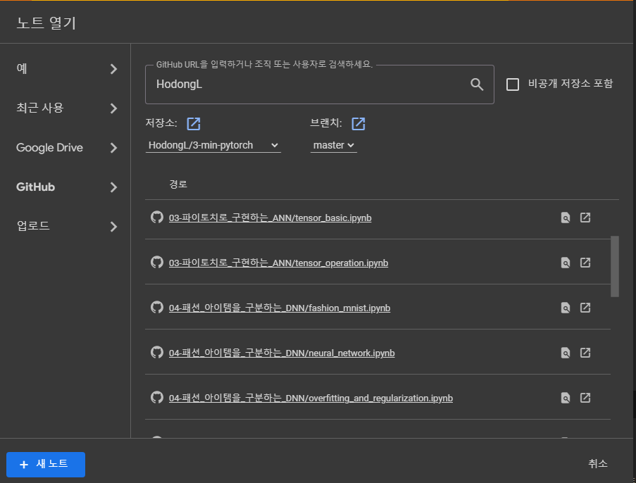 Colab에서 GitHub의 노트북 파일 불러오기