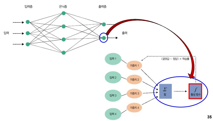 은닉층에서 다 더해서 임계치를 넘는지 안넘는지에 따라 다음 단계로 출력