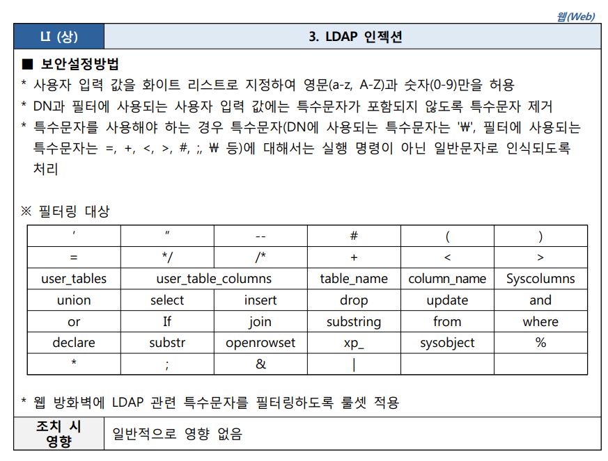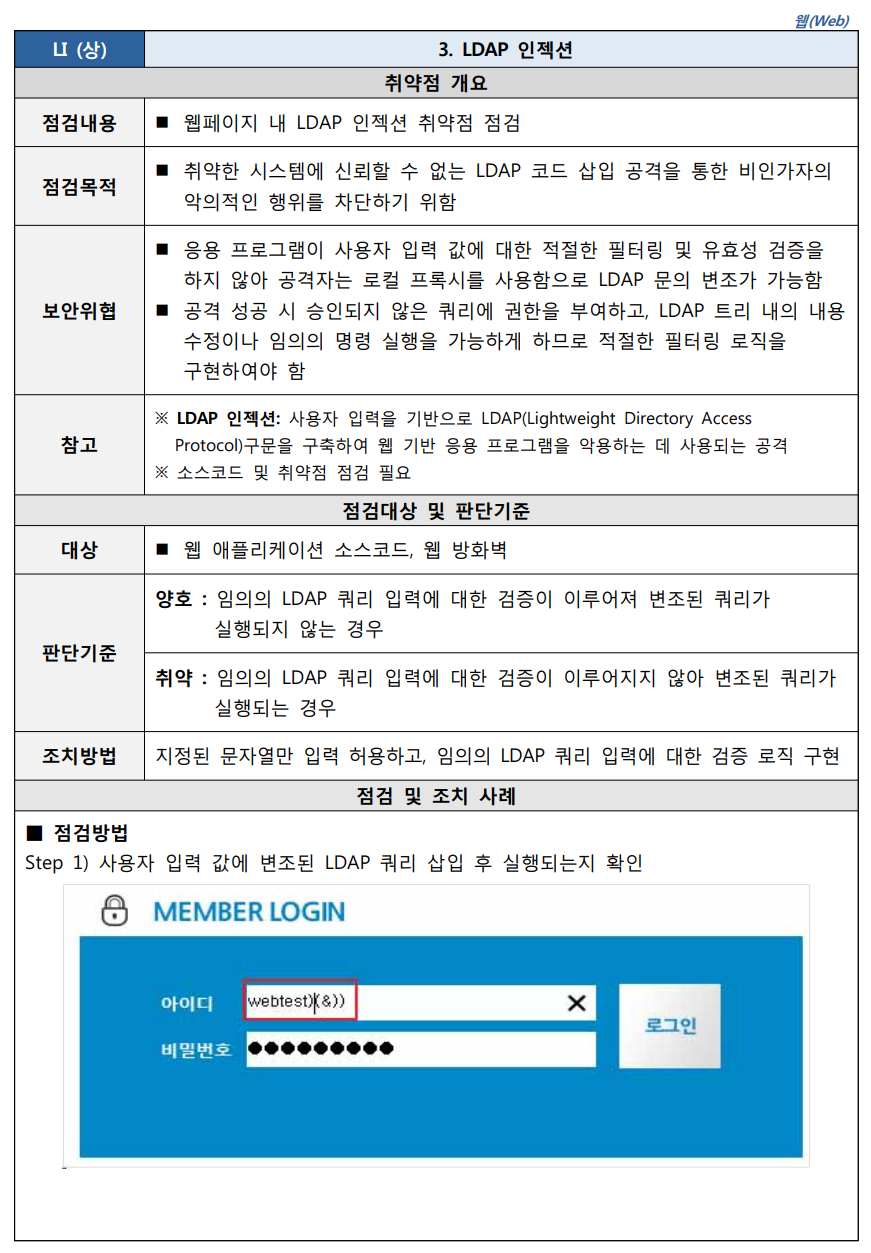 사용자 입력값이 LDAP Query를 구성할 때 이를 이용해 비정상적인 LDAP 동작을 유도하는 공격