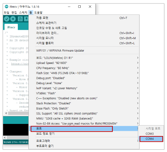 툴 -> 포트 -> 확인한 포트로 변경