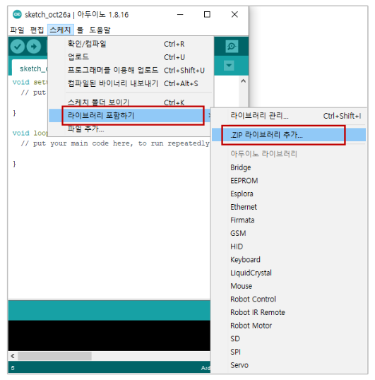 스케치 -> 라이브러리 포함하기 -> .zip 라이브러리 추가
