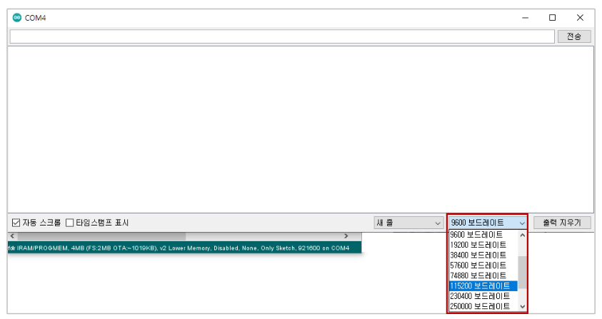 시리얼 모니터 하단의 보드레이트를 9600 -> 115200으로 변경