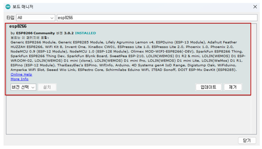 esp8266 by esp8266 community 3.1.2 version 설치 또는 업데이트