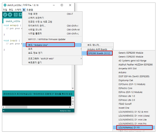 툴 -> 보드 -> ESP8266 Boards (3.0.2) LOLIN(WeMos) D1 R1 선택