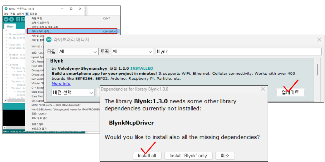 툴 -> 라이브러리 관리 -> blynk 설치