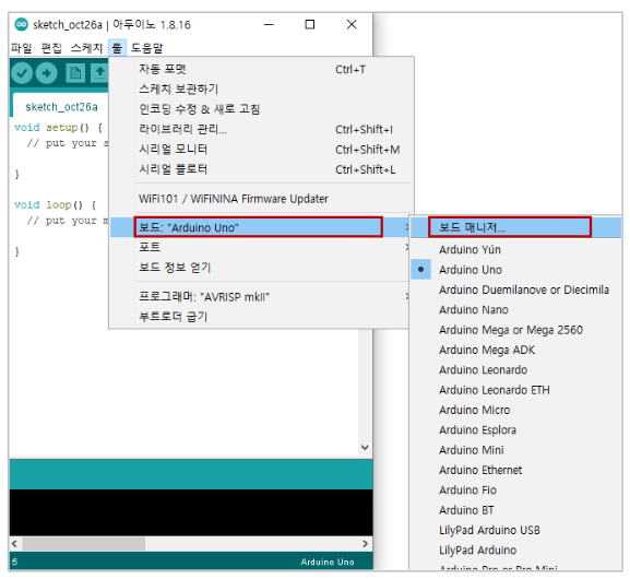 툴 -> 보드: Arduino Uno -> 보드 매니저 클릭