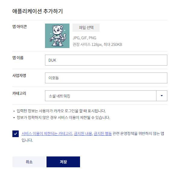 카카오계정, 개발자 이름 설정 -> 회원가입