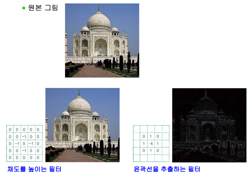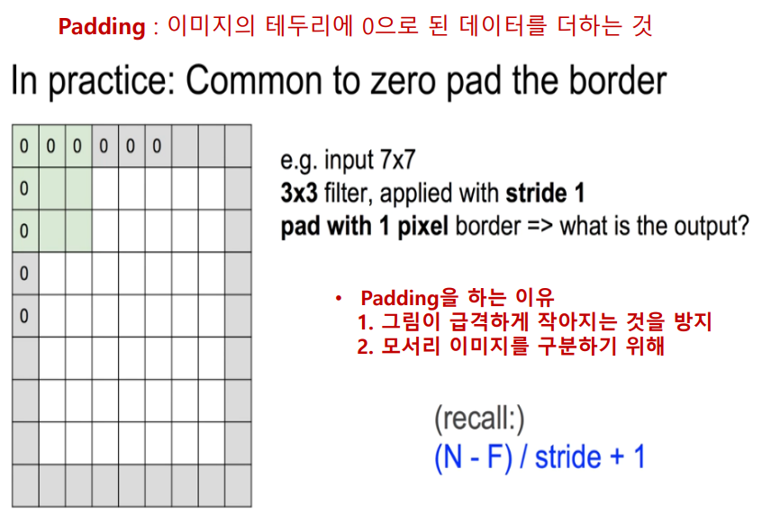 - 필터 적용 시 이미지 왼쪽 위에서 오른쪽 밑까지 이동하면서 곱하고 더하는 작업