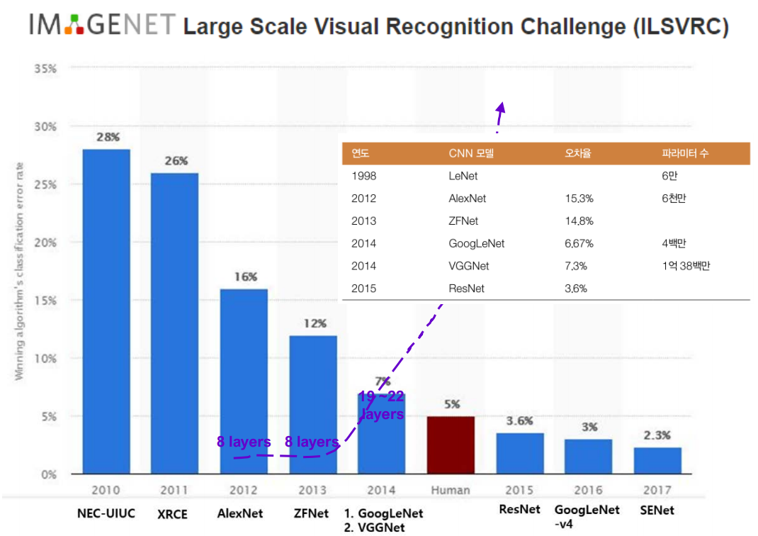 – 이미지 1000만장을 학습하고, 테스트 이미지 15만장으로 인식률을 평가하는 대회