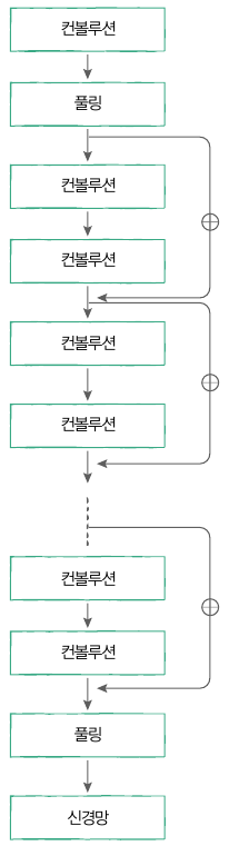 - ResNet에서는 신경망을 Residual 블록으로 나눔 – Residual 블록의 입력 x를 출력에 더함