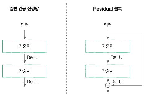 - ResNet에서는 신경망을 Residual 블록으로 나눔 – Residual 블록의 입력 x를 출력에 더함