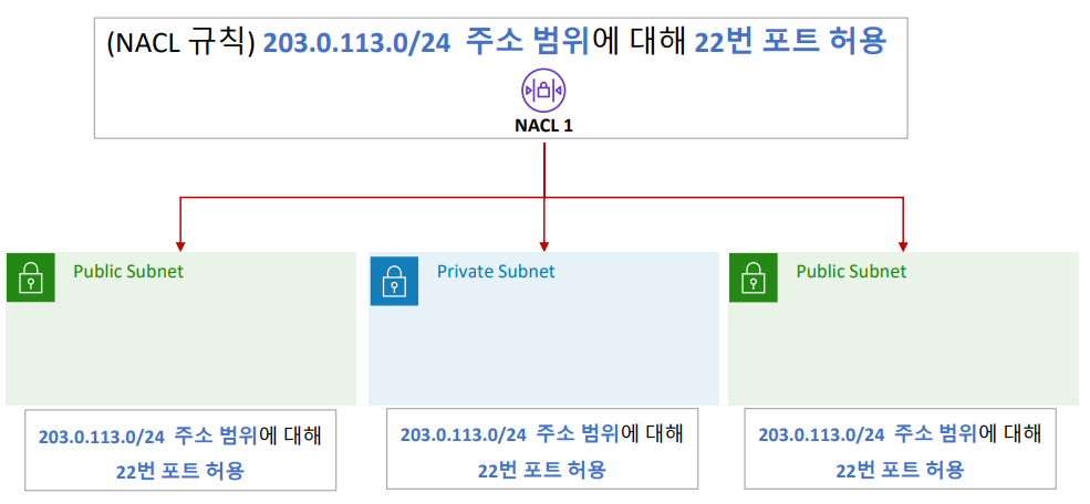서브넷 단위로 적용되며, 모든 인바운드 및 아웃바운드 트래픽 허용