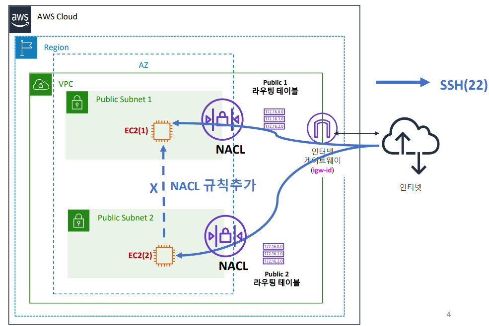 각 subnet에는 NACL이 구성되어 있음 -> subnet으로 들어오는 트래픽과 subnet에서 나가는 트래픽 제어