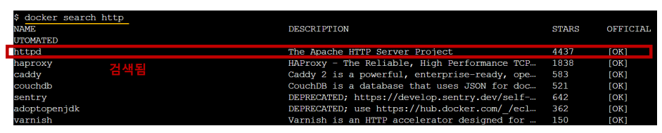 1) 웹 서버 컨테이너 만들기 위해 아파치서버 이미지 검색
