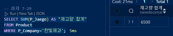 한빛제과에서 제조한 제품의 재고량(P_Jaego) 합계를 제품(Product) 테이블에서 검색해보자.