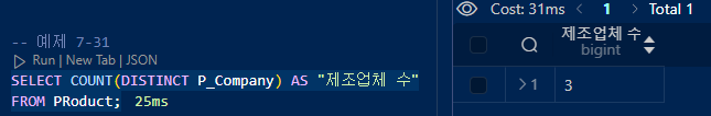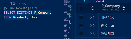 제품(Product) 테이블에서 제조업체(P_Company) 속성을 중복 없이 검색해보자.
