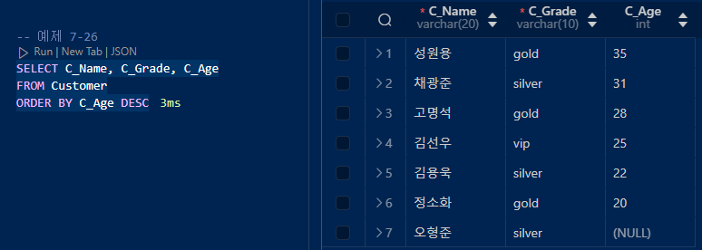 고객(Customer) 테이블에서 고객이름(C_Name), 등급(C_Grade), 나이(C_Age)를 검색하되,
