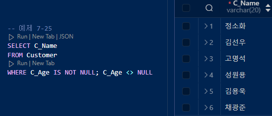 고객(Customer) 테이블에서 나이(C_Age)가 이미 입력된 고객의 고객이름(C_Name)을 검색해보자