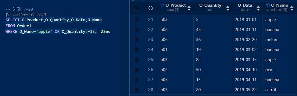 주문제품(O_Product), 수량(O_Quantity), 주문일자(O_Date)를 검색해보자.