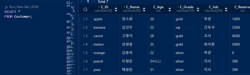 고객 (Customer) 테이블에서 존재하는 모든 속성을 검색해보자