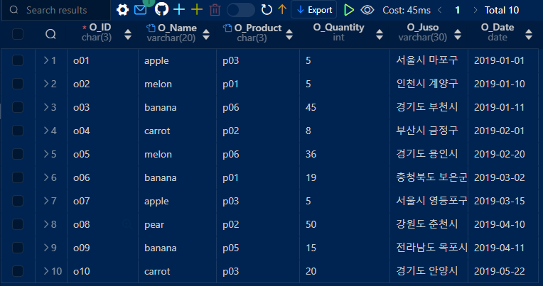 주문일자(O_Date), 주문고객(O_Name)을 검색해보자.