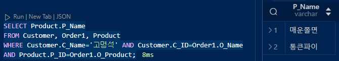 판매(Panmae) 데이터베이스에서 고명석 고객이 주문한 제품의