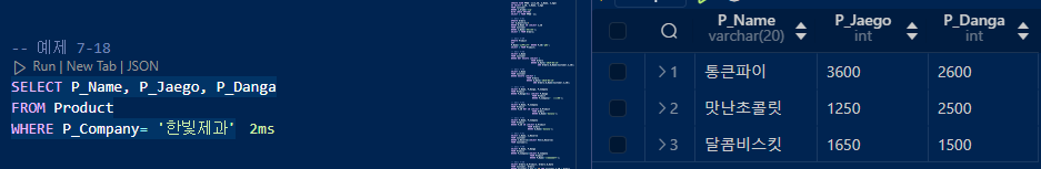 제품명(P_Name),재고량(P_Jaego),단가(P_Danga)를 검색해보자.