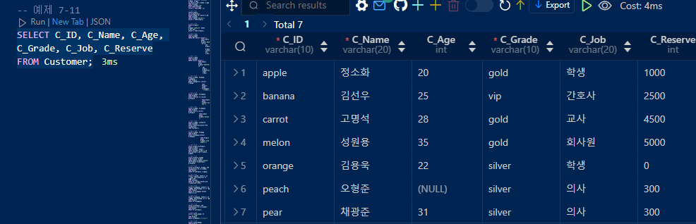 고객(Customer) 테이블에서 성이 김 씨인 고객의 고객이름(C_Name), 나이(C_Age), 등급(C_Grade), 적립금(C_Reserve)을 검색해보자