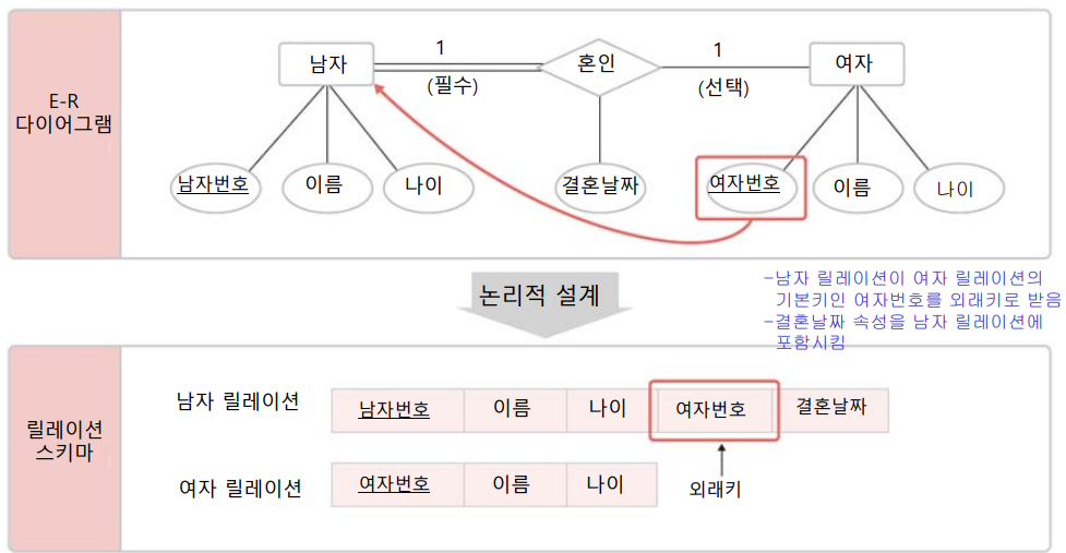 - 관계에 필수적으로 참여하는 개체의 릴레이션이 선택적으로 참여하는 개체의 릴레이션의 기본키 받아 외래키로 지정 -> 선택적으로 참여하는 릴레이션에 외래키로 지정시 널 값이 저장되는 경우가 많을 것임