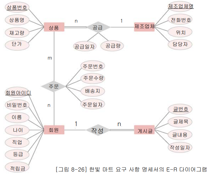 [그림 8-26] 한빛 마트의 E-R 다이어그램을 릴레이션으로 변환하는 과정