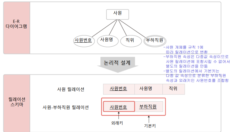 - 새로운 릴레이션의 기본키는 다중 값 속성과 외래키를 조합하여 지정하고, 릴레이션의 이름은 자유롭게 정함