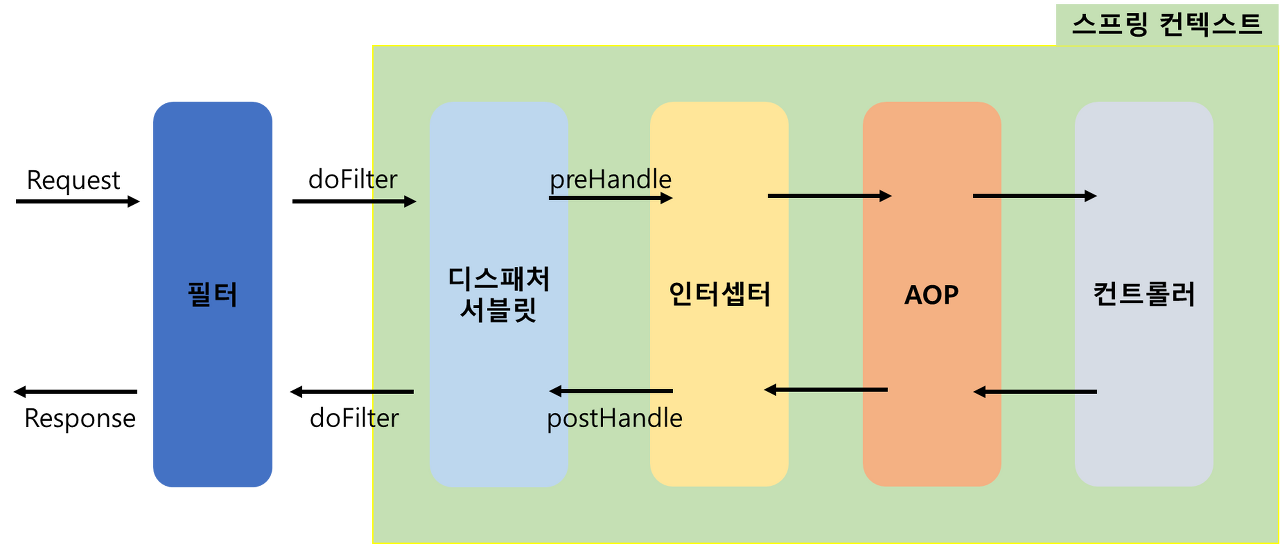 요청에 대한 인증, 권한 체크 등을 하는 데 쓰임 / 필터를 문지기라 생각하면 편함